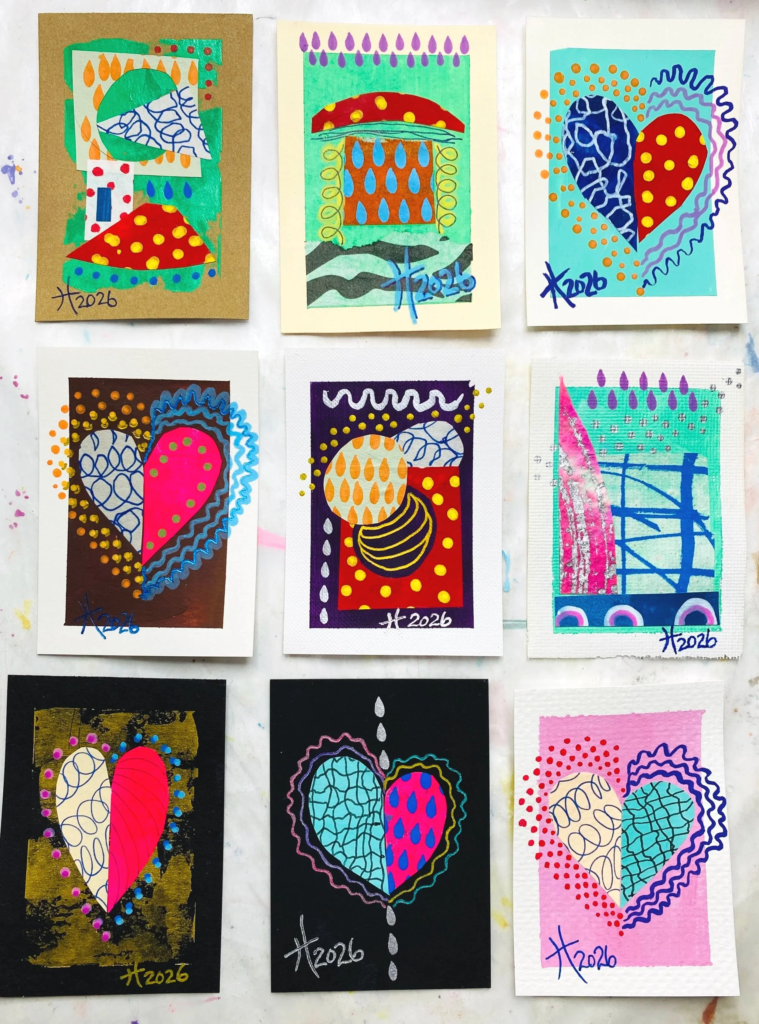 Paint, markers and collage on various paper backgrounds Artist Trading Cards created by Tristina Dietz Elmes.