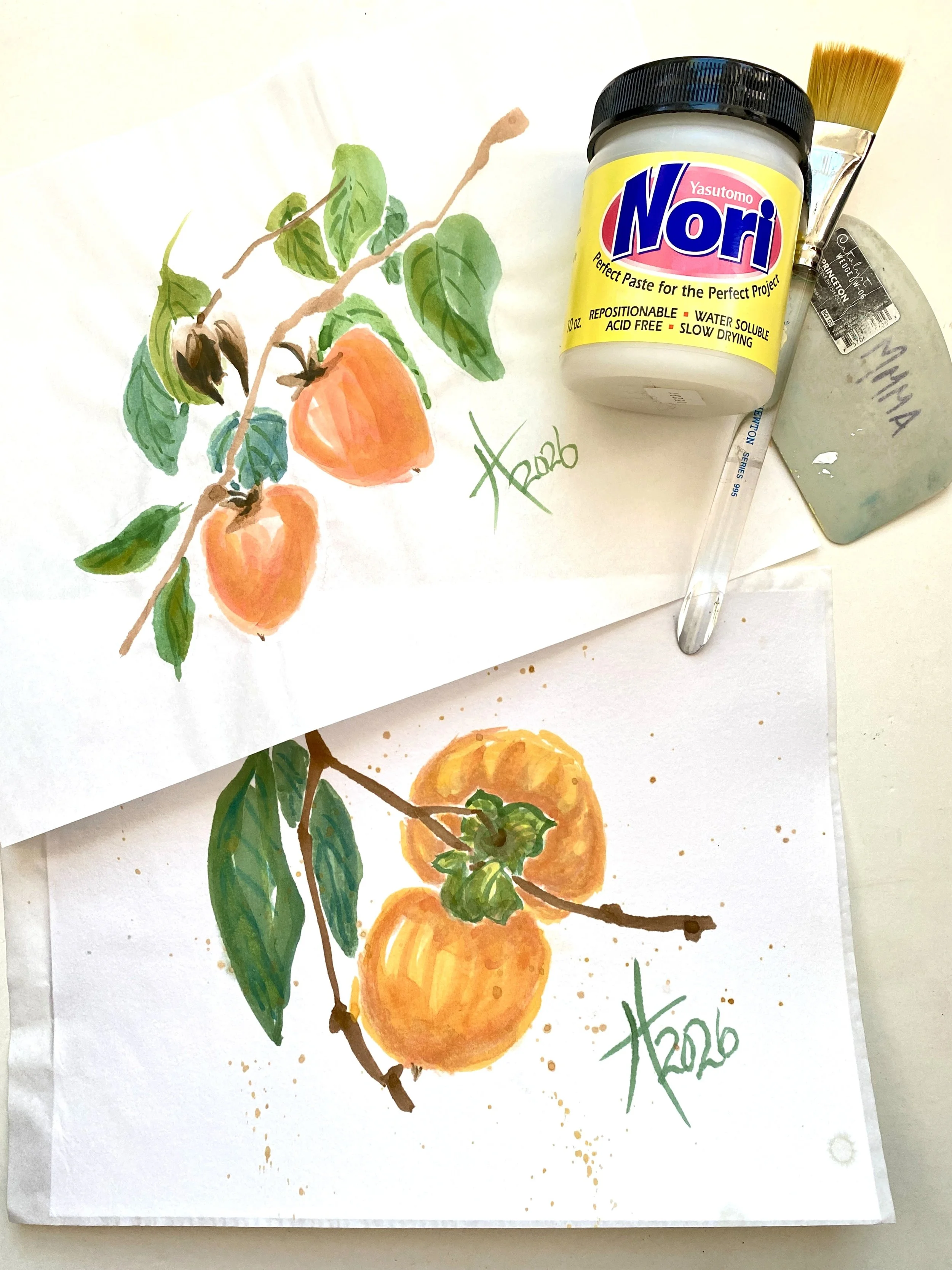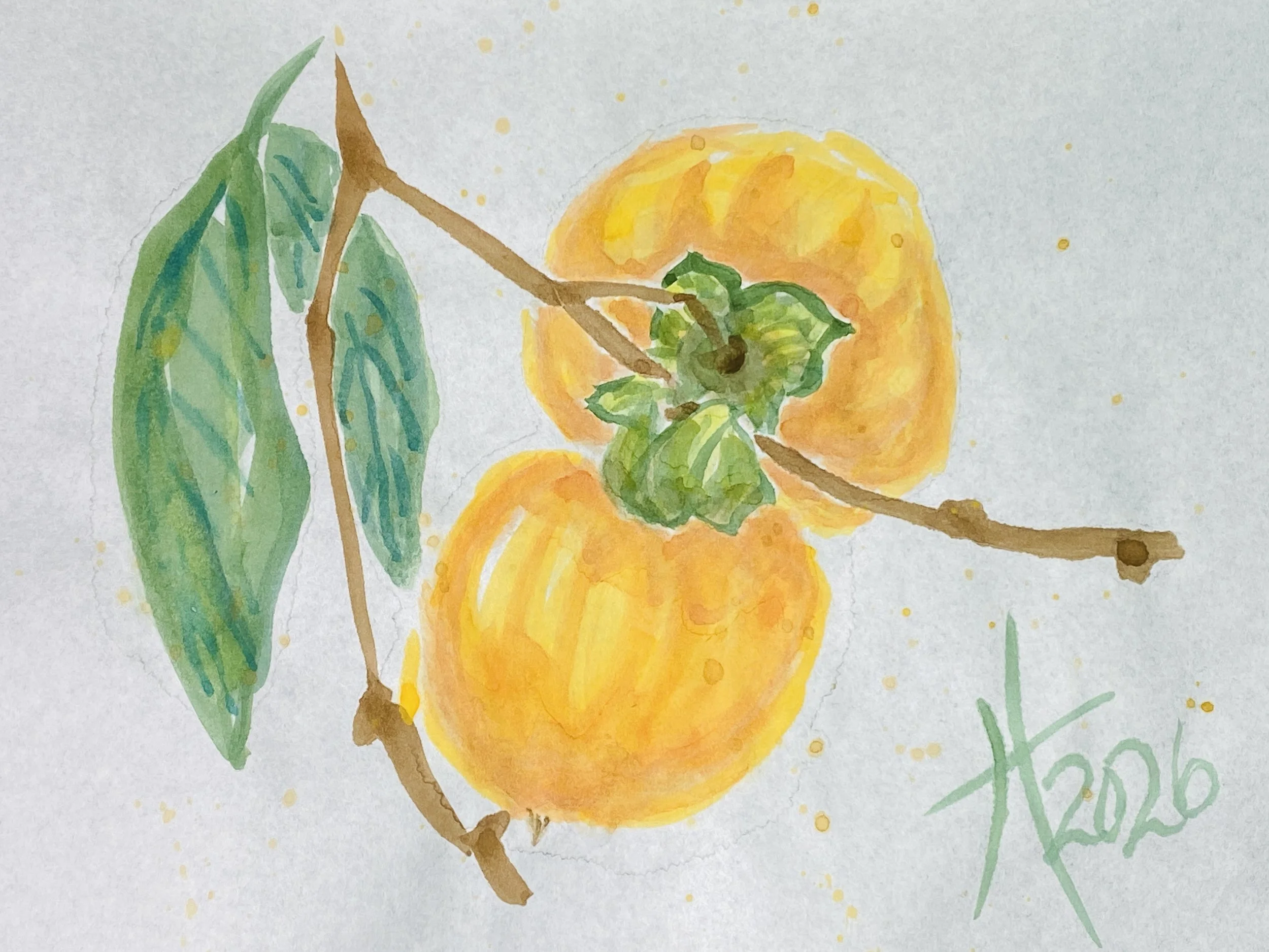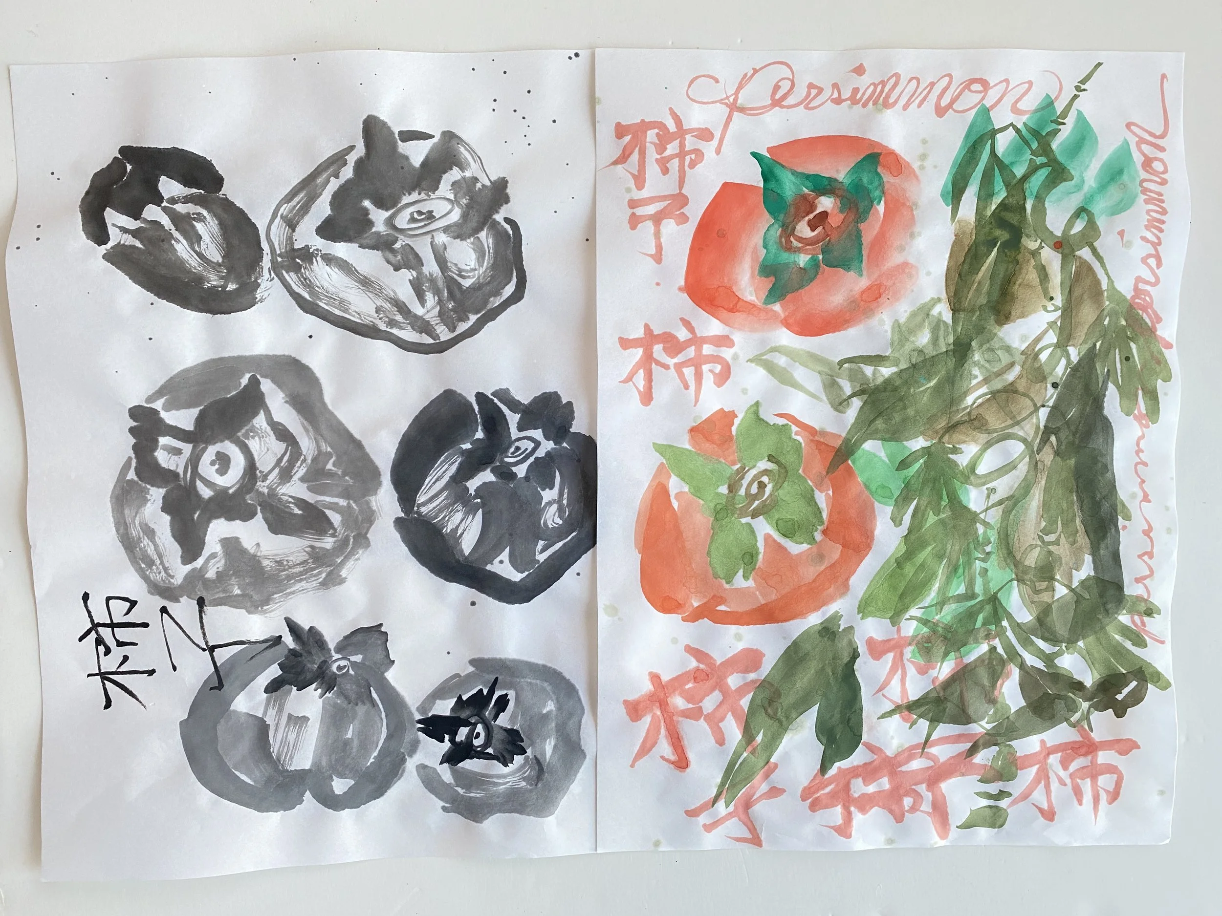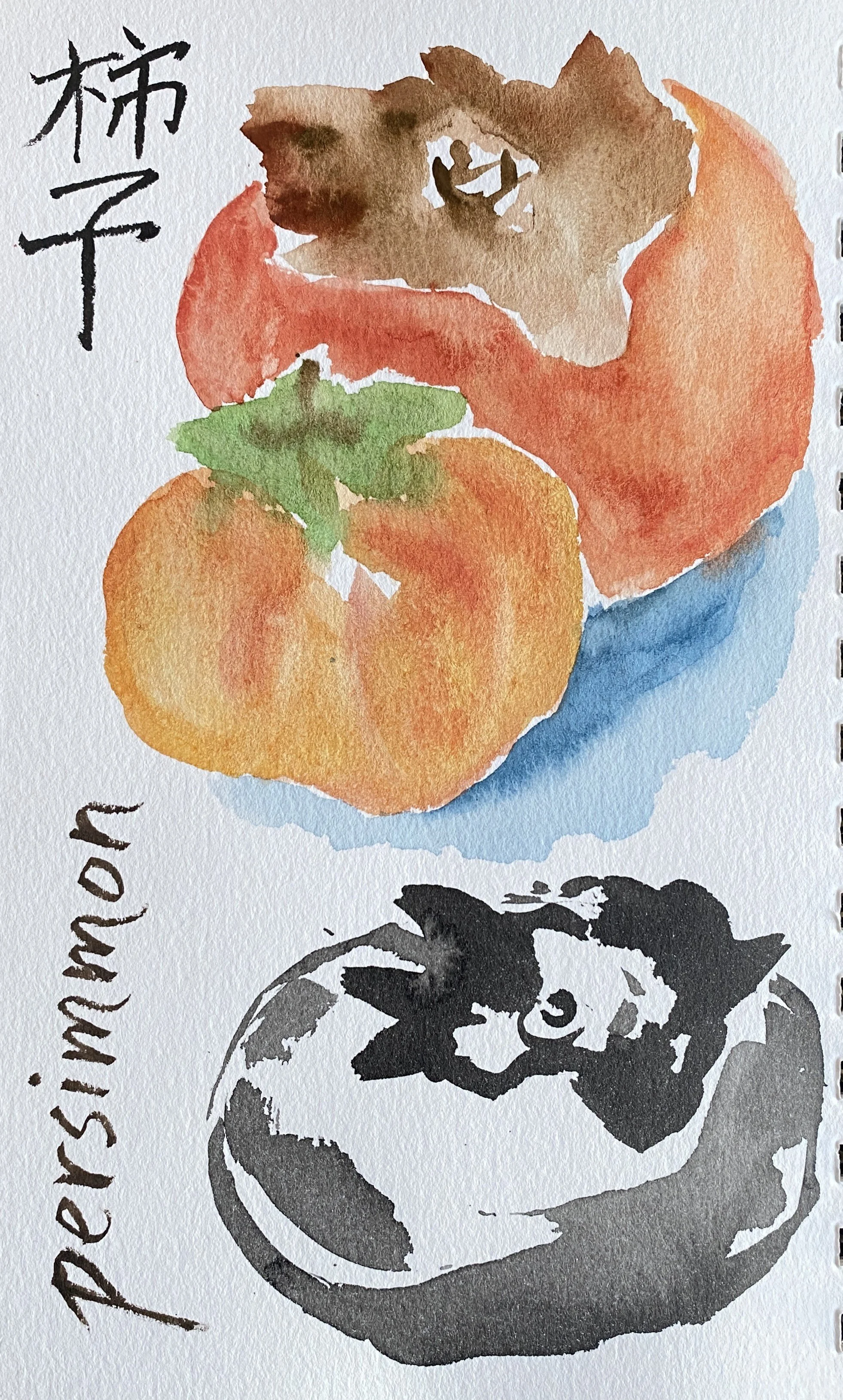 Persimmons practice painting and calligraphy on watercolor paper by Tristina Dietz Elmes.