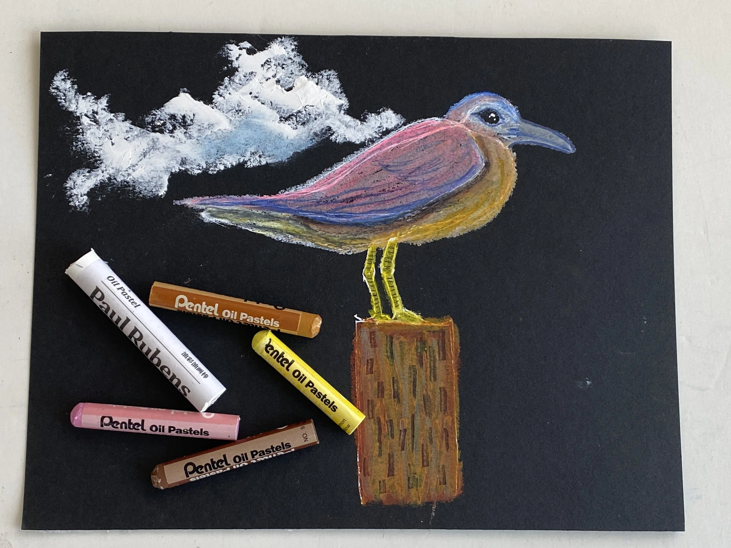 During the session I draw a Painted Bunting and paint it with watercolors, then draw an American Robin with Inktense blocks and activate with water, and lastly use my own photos of a local Florida Seagull to sketch with a white acrylic marker on black paper and color with oil pastels and Prismacolor pencils.
