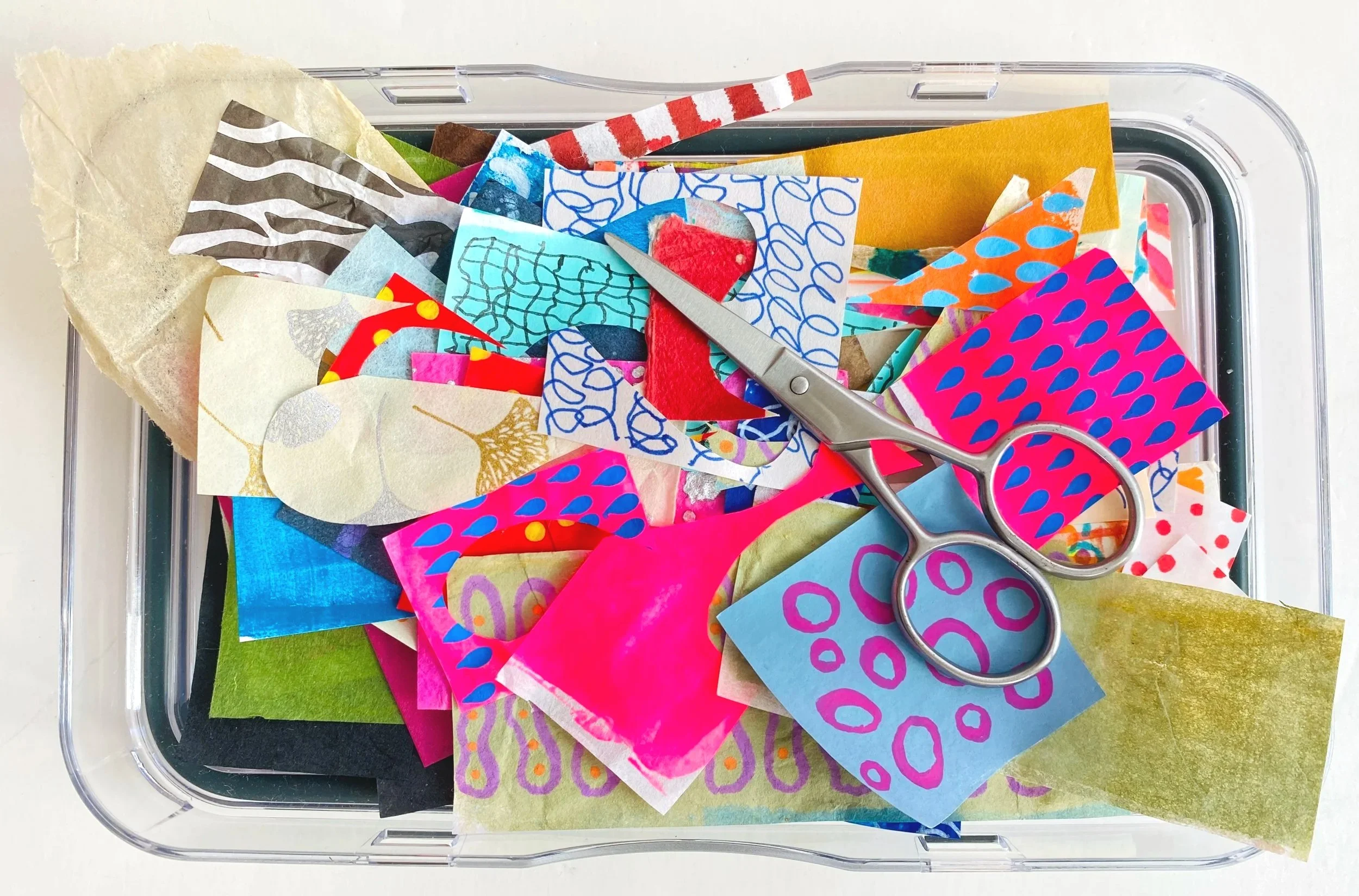 Tray of cut collage papers, purchased and hand painted, by Tristina Dietz Elmes.