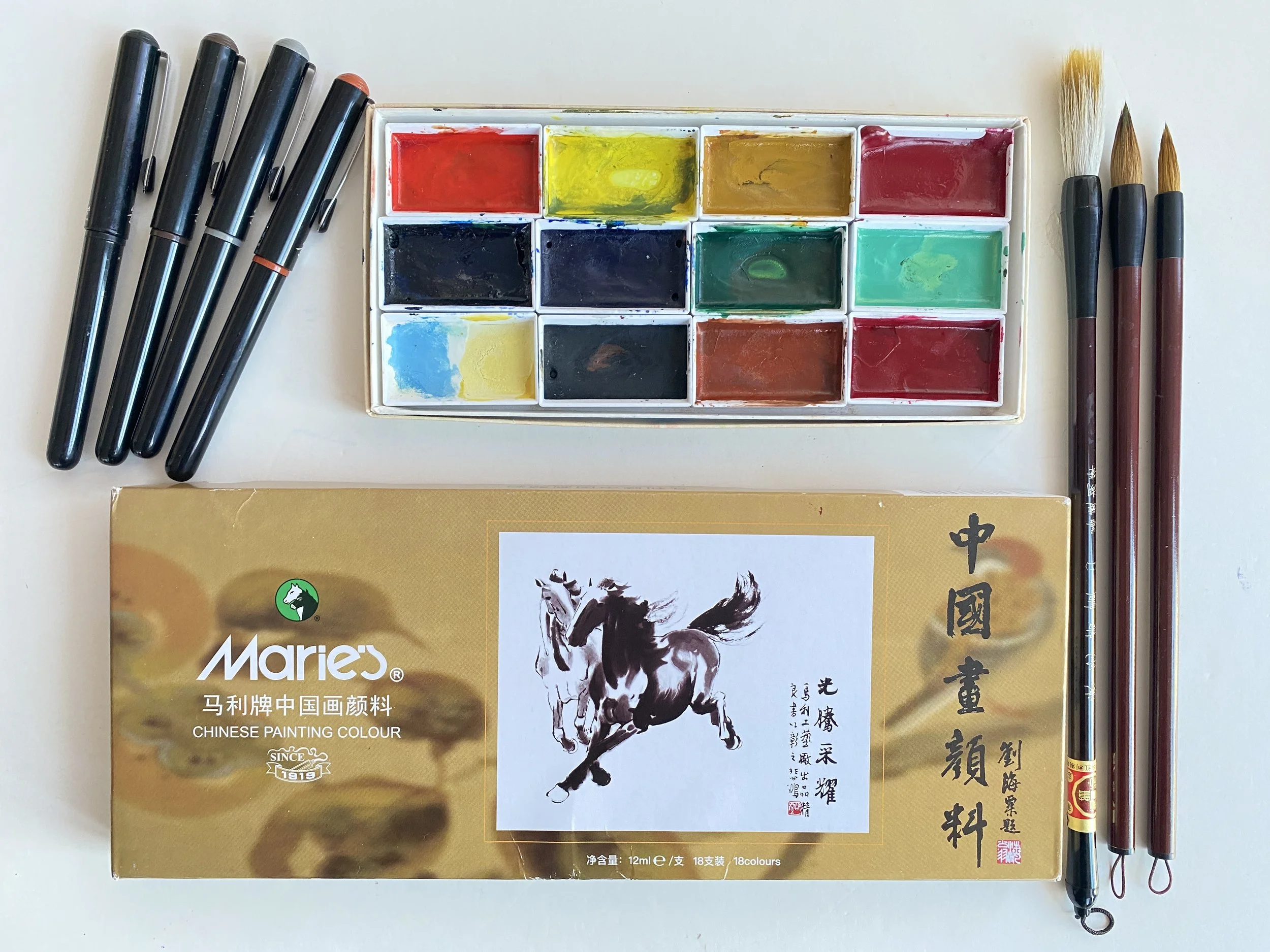Marie’s Chinese Paints, Yasutomo Gansai paints, Asian pant brushes and Pentel Brush Pens.