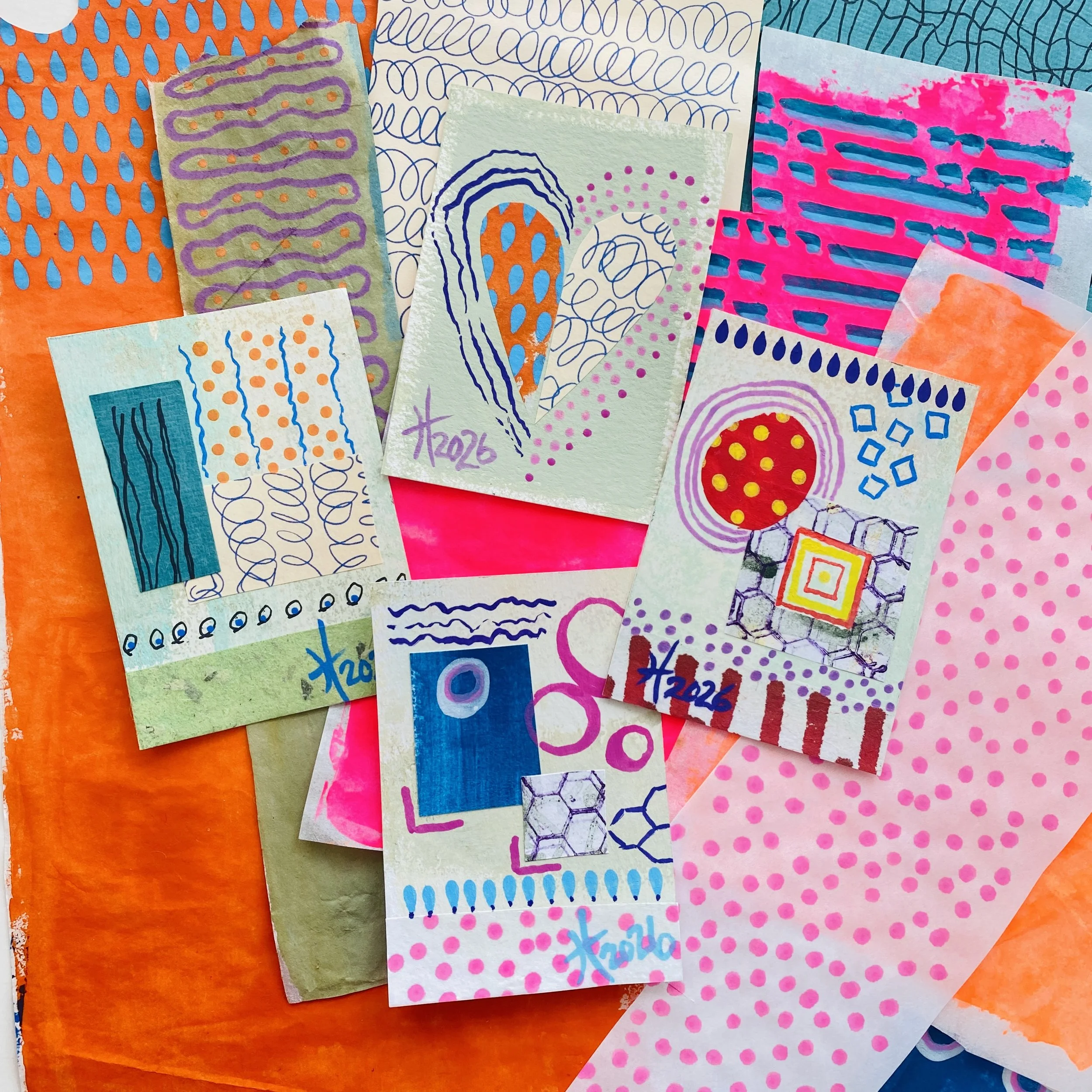 Artist Trading Cards with hand painted collage paper designs by artist Tristina Dietz Elmes.
