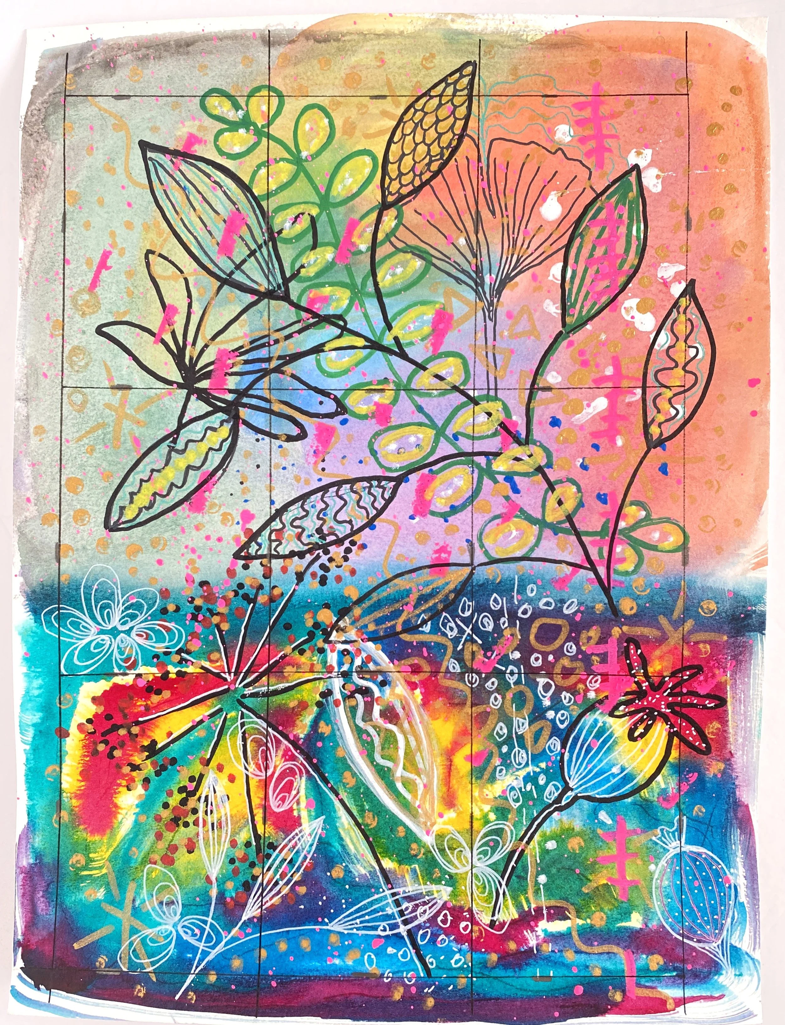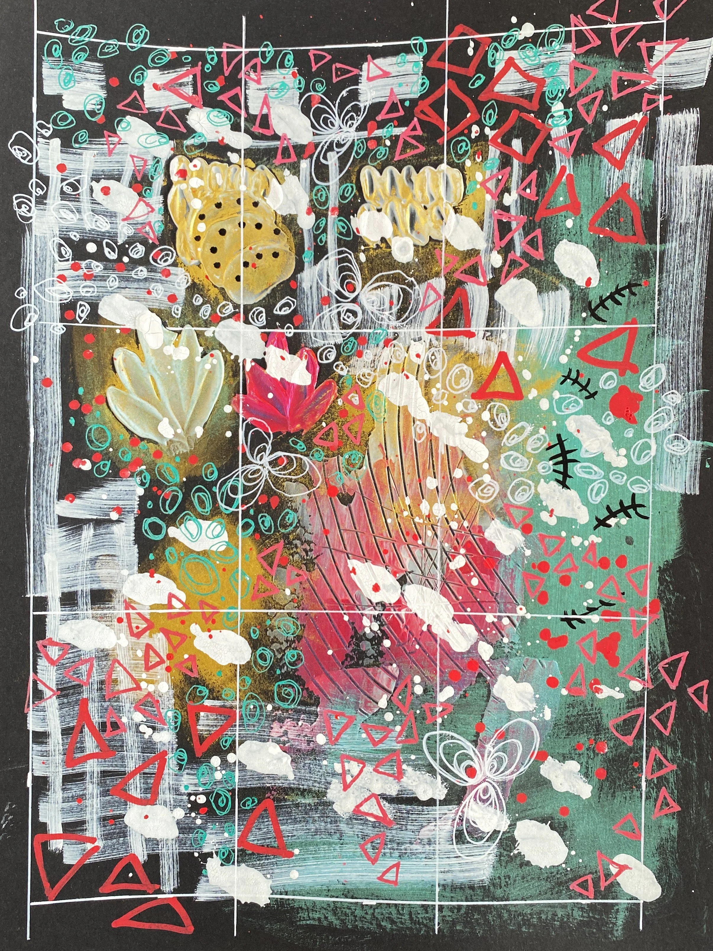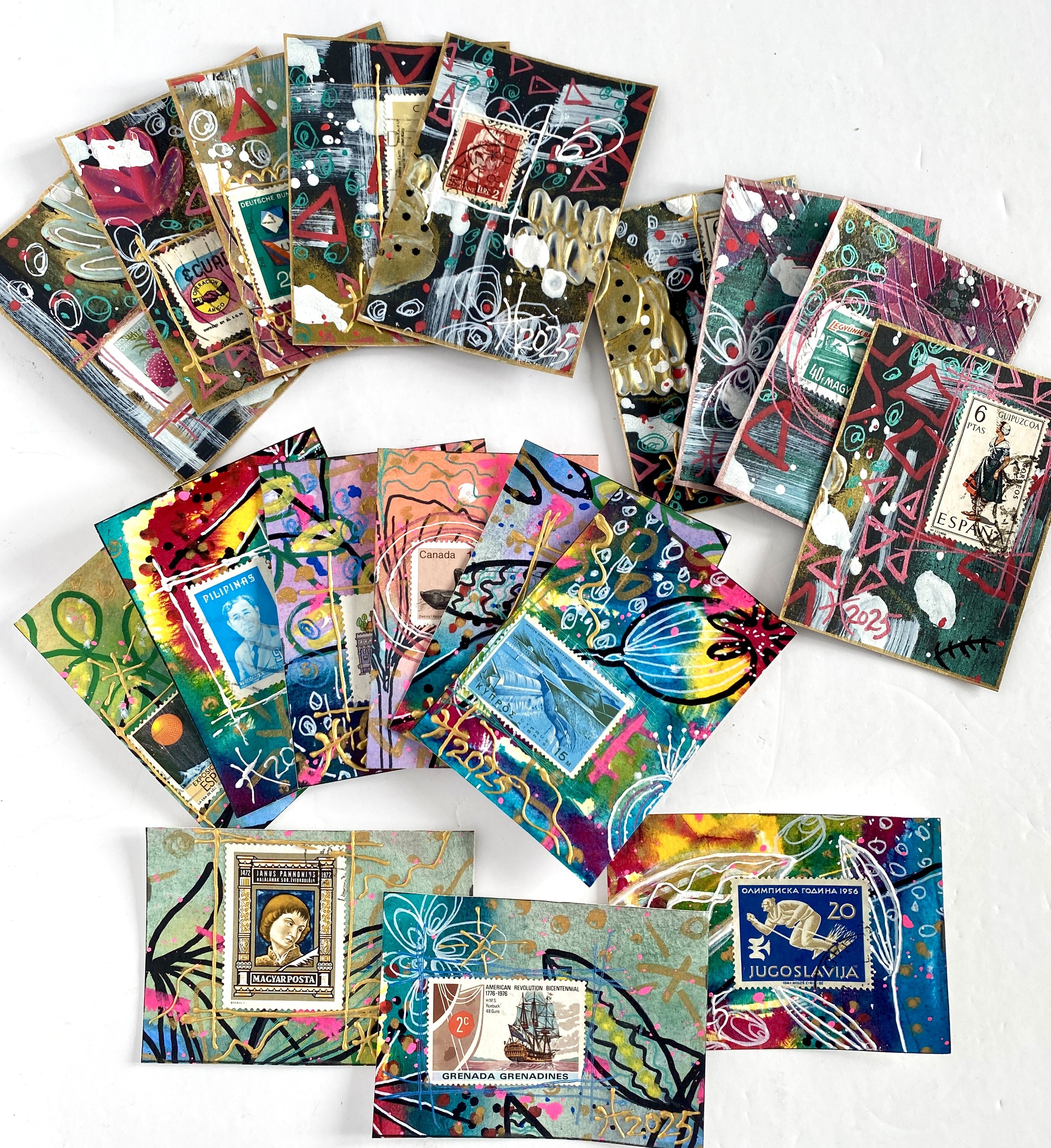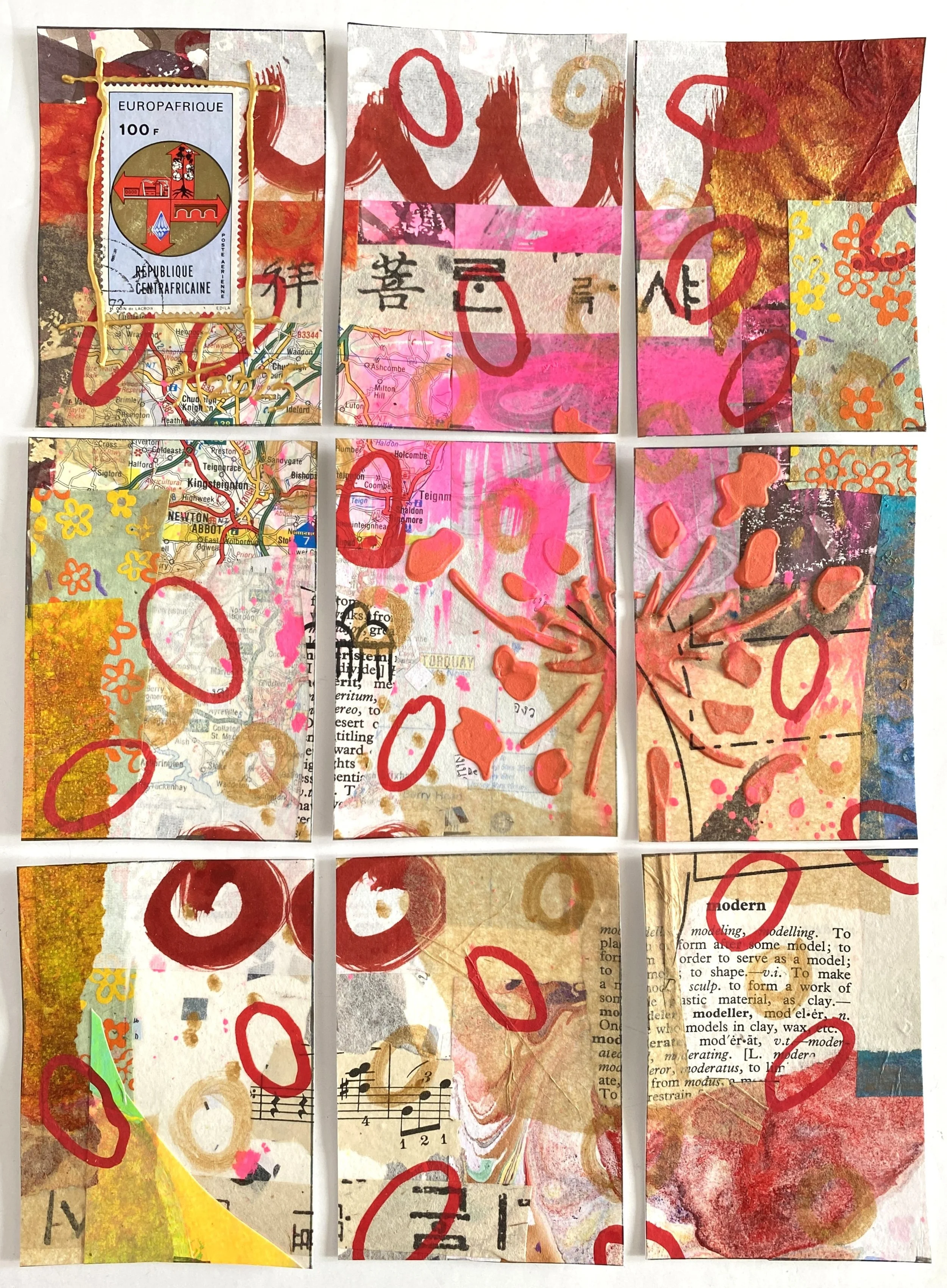 In this article I share how to let go and have fun collaging, painting and mark-making on a large sheet of paper that will eventually turn into an Artist Trading Card series of 9 at one time. The process of creating multiple ATC’s at once is very freeing and the resulting artworks are usually surprisingly great!