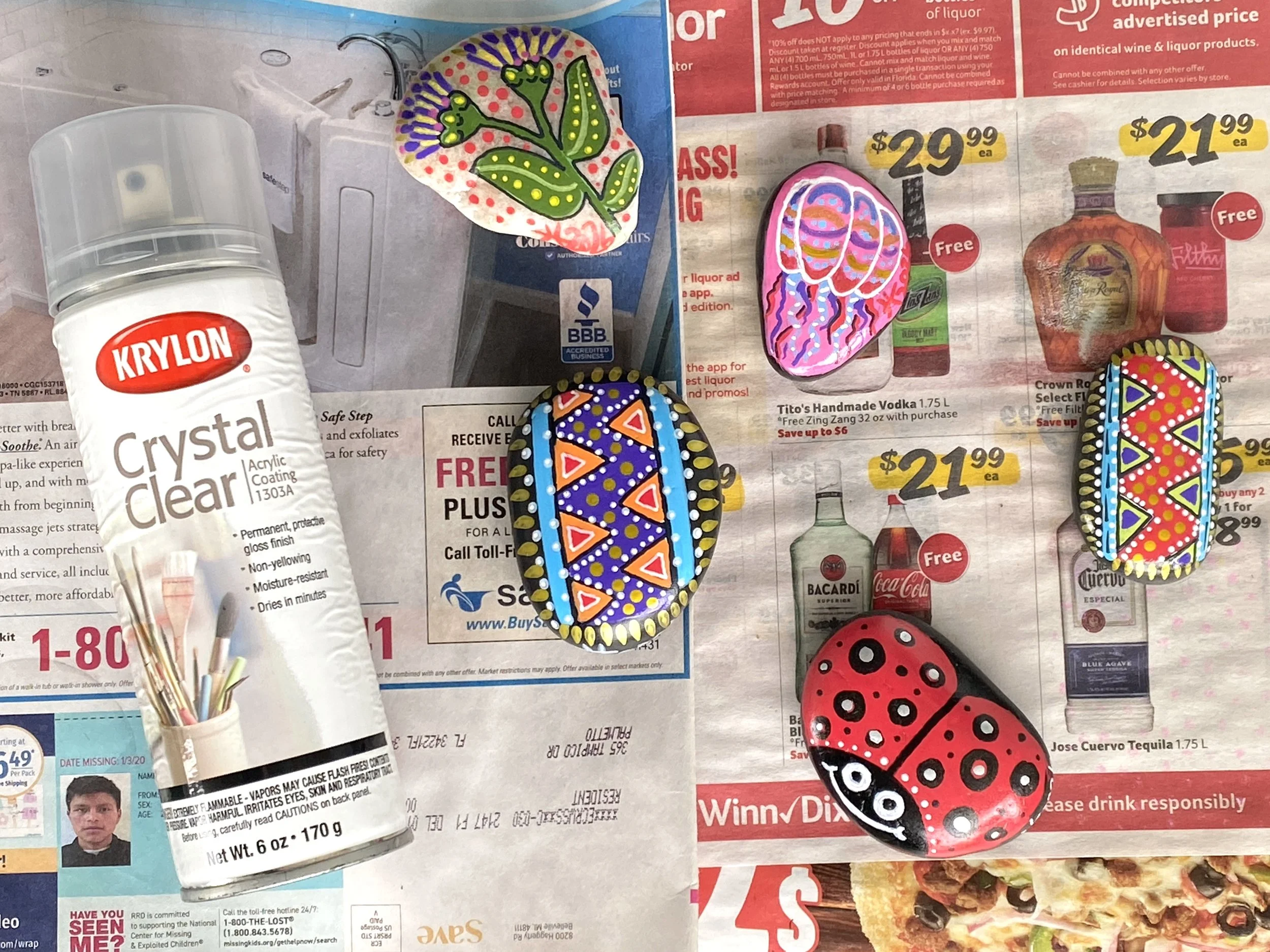 Rock Art getting a clear coat of gloss acrylic spray after the paint is fully dry outside. Paintings by Tristina Dietz Elmes.