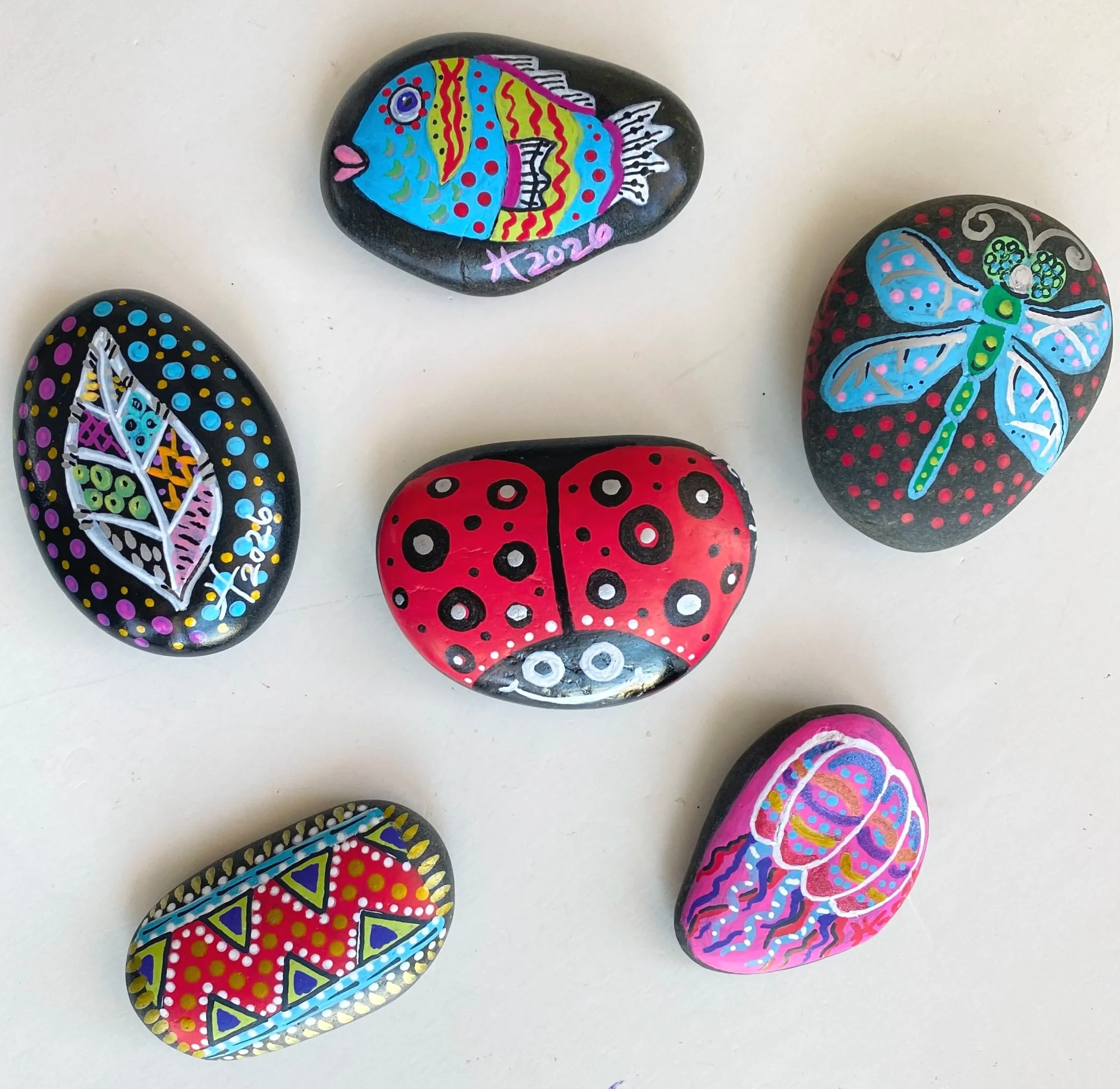 Rock Art designs painted during the live session on both purchased and gathered stones by Tristina Dietz Elmes.