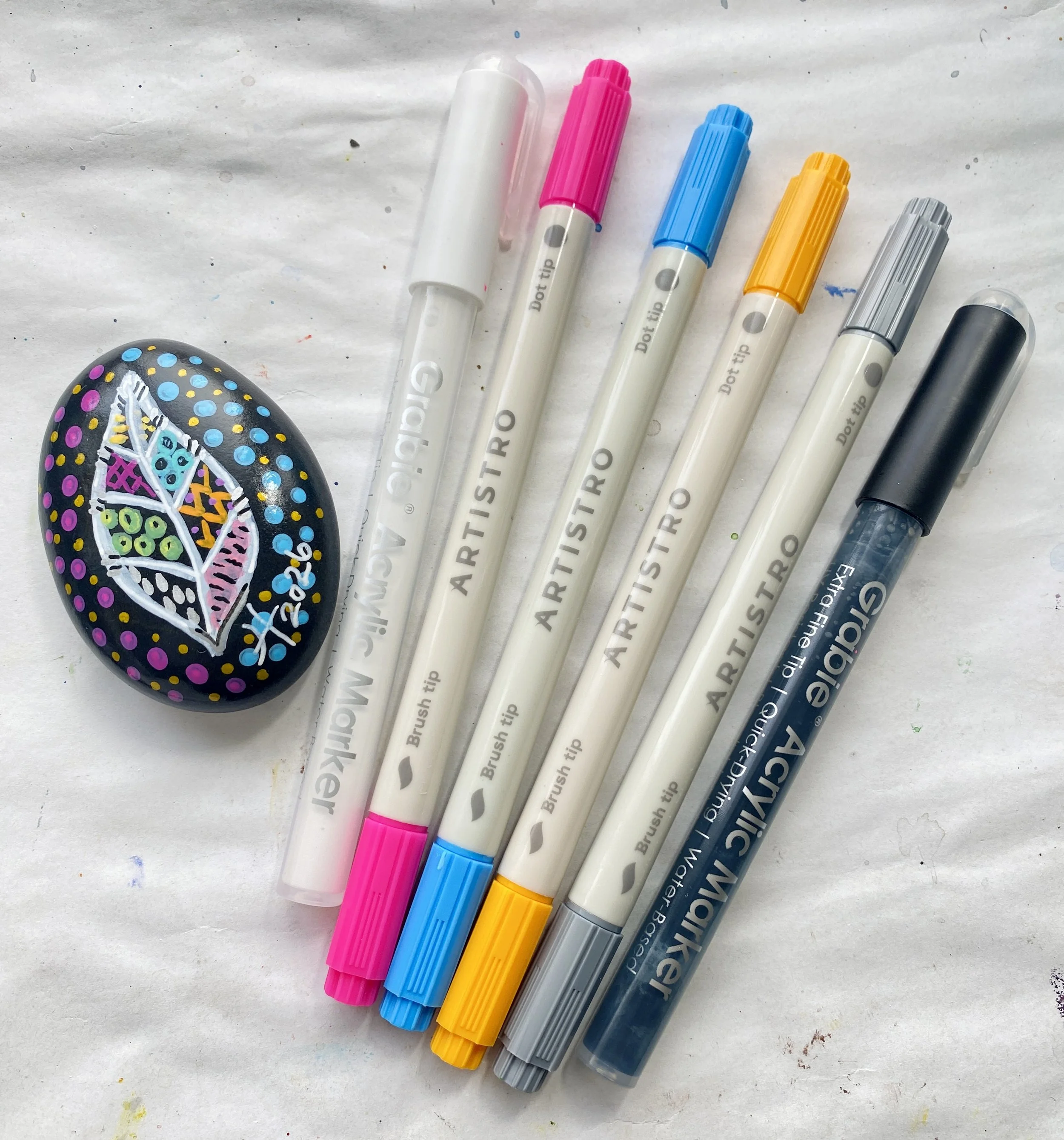 My favorite Artistro and Grabie acrylic markers for Rock Art and a painted stone by Tristina Dietz Elmes.