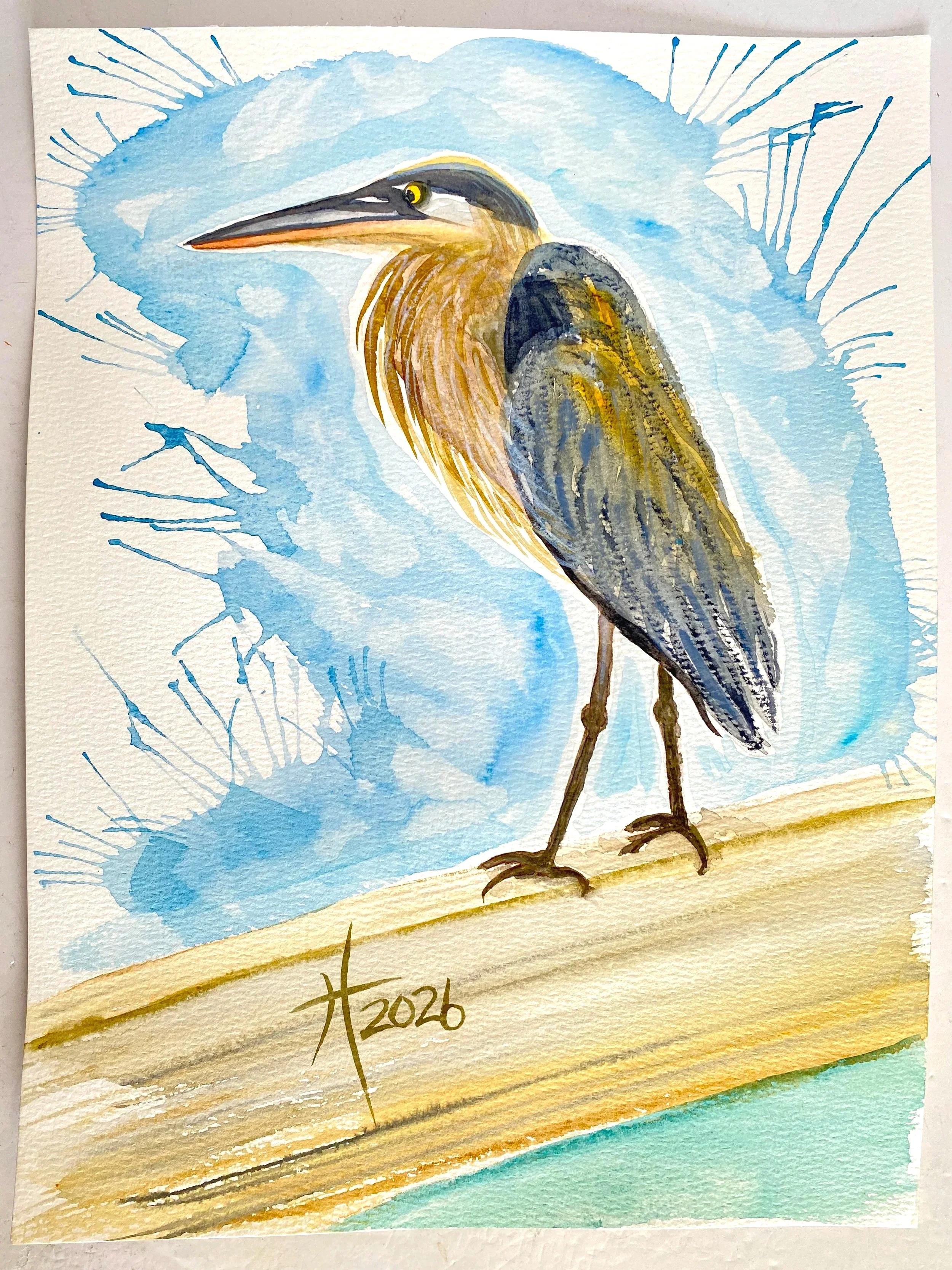 “Great Blue Heron on the Dock” watercolor painting on paper by Tristina Dietz Elmes.
