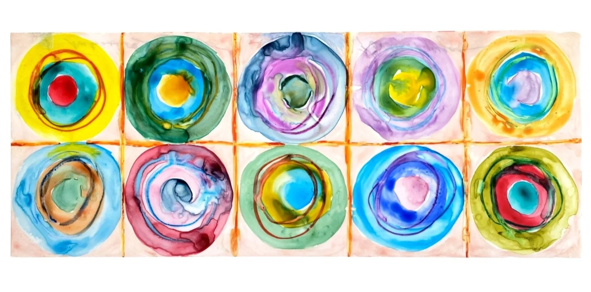 “Kandinskyesque” watercolor and water soluble artist crayons painting on translucent Yupo paper by Tristina Dietz Elmes. At the time of writing this article, the original painting is available on my Etsy Shop HERE.