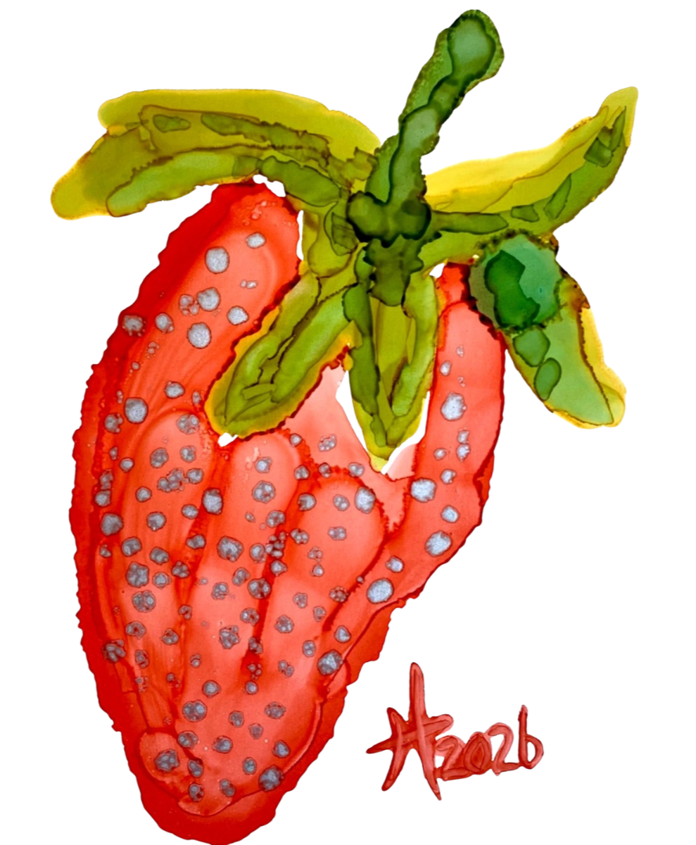 “Strawberry Sweet” alcohol inks strawberry painting on white Yupo paper by Tristina Dietz Elmes. At the time of writing this article, the original painting is available on my Etsy Shop HERE.