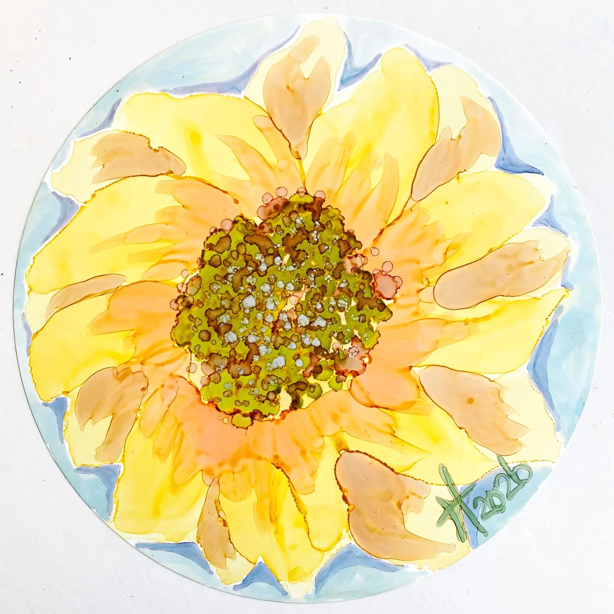 “Happy Day Sunflower” floral alcohol ink painting on round white Yupo paper by Tristina Dietz Elmes. At the time of writing this article, the original painting is available on my Etsy Shop HERE.