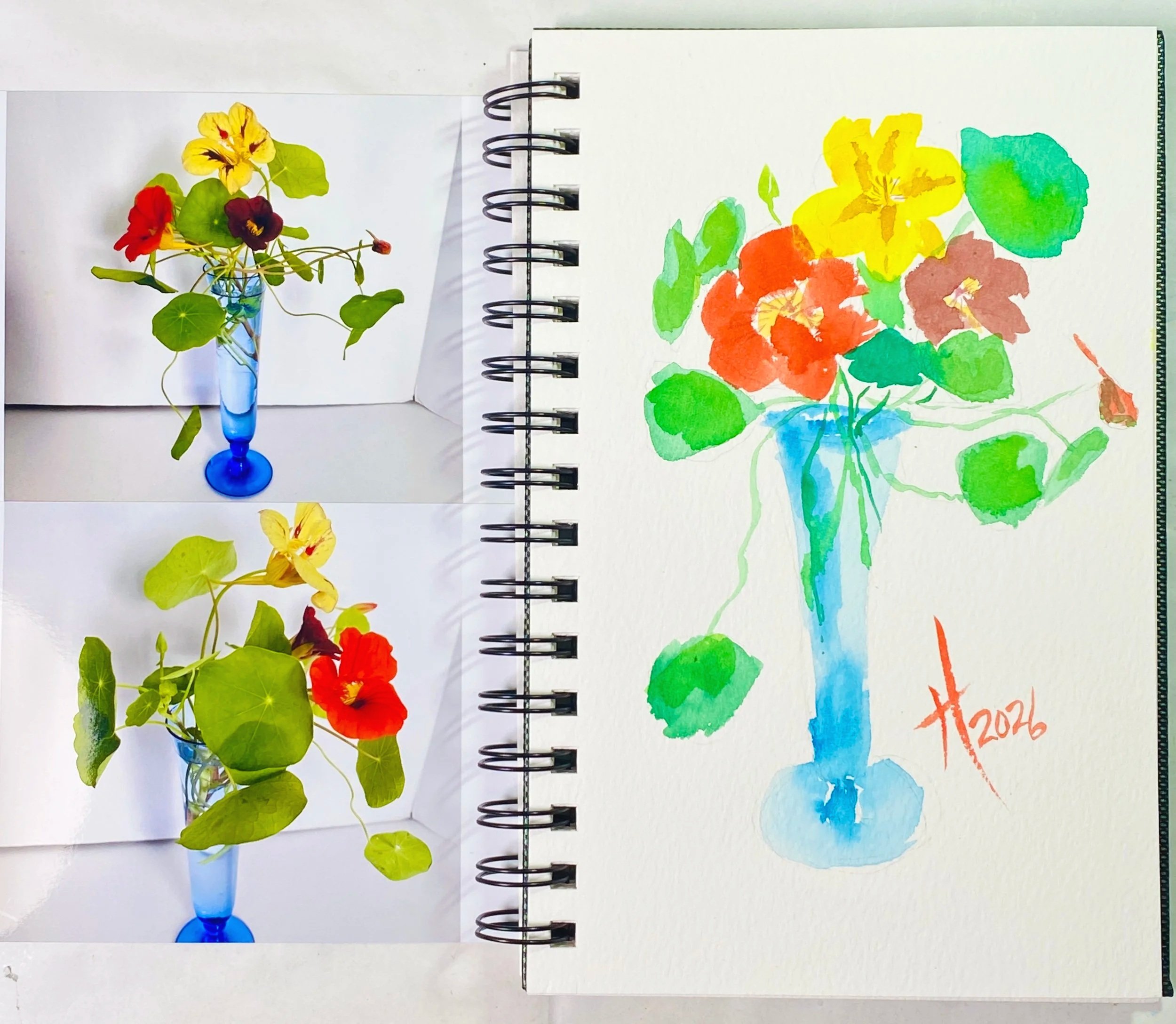 Reference photos of nasturtium in a blue vase with a quick watercolor journal sketch.