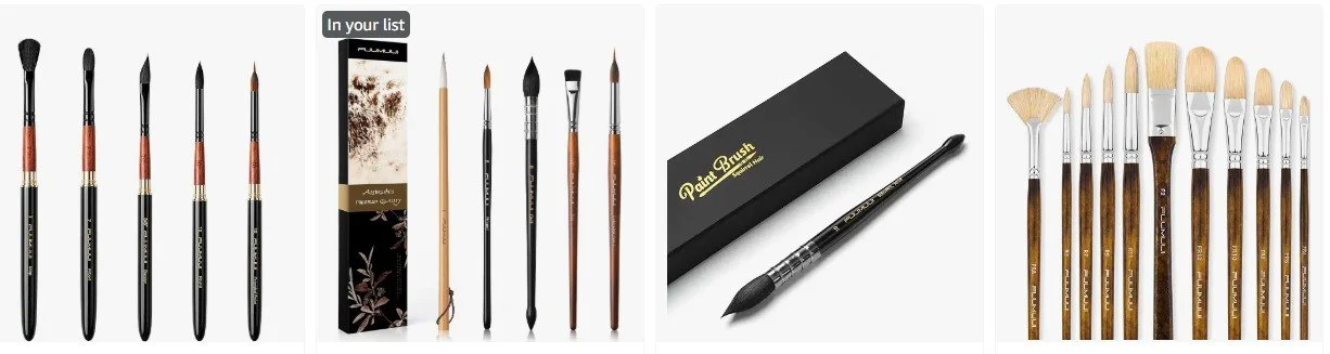 Princeton Paint Brushes from Amazon. My favorites are the VelvetTouch and Heritage for Watercolors and Artiste Select for Acrylics. In general, I like the White Tipped Brushes for Oils.